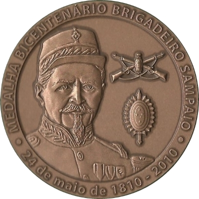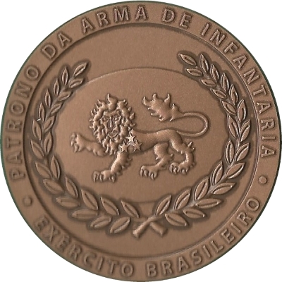 Escudo circular, em bronze envelhecido, com 50 milímetros de diâmetro. Anverso carregado com a figura, de perfil, do Brigadeiro Antônio de Sampaio, contendo, à sinistra do homenageado, o símbolo do Exército Brasileiro, encimado pelo símbolo da Arma de Infantaria; bordadura com 8 milímetros de espessura, contendo, em chefe, o dístico “MEDALHA BICENTENÁRIO BRIGADEIRO SAMPAIO” e, em contrachefe, a data “24 de maio de 1810 - 2010”. Verso carregado com uma elipse, contendo um leão passante aleopardado, em que figuram 3 (três) estrelas singelas, figura heráldica que alude à bravura do Brigadeiro Sampaio quando da Campanha da Tríplice Aliança e aos 3 (três) ferimentos sofridos na batalha de Tuiuti, travada em 24 de maio de 1866; conjunto ornamentado com dois ramos de louro; bordadura com 8 milímetros de espessura, contendo o dístico “PATRONO DA ARMA DE INFANTARIA DO EXÉRCITO BRASILEIRO”. |