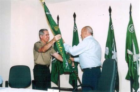 Na foto da esquerda, o Gen Ex DOMINGOS MIGUEL ANTÔNIO GAZZINEO, que assumiu a Presidência da Legião da Infantaria de Fortaleza, recebe do 2º Ten Inf ROBÉRIO, da 10ª Companhia de Guardas, Oficial de carreira da Arma de Infantaria mais moderno na Guarnição, o Estandarte da Legião de Fortaleza. Já na foto à direita, o Gen Ex GAZZINEO, repassa às mãos do Gen Div LIMA VERDE, Cmt da 10ª RM, Oficial da Ativa da Arma de Infantaria mais antigo da Guarnição, o Estandarte que ficará exposto no Gabinete do Comandante da 10ª RM. Na ocasião o Gen LIMA VERDE foi empossado como Presidente-Executivo da Legião da Infantaria. Avante Legião! Salve a Infantaria do Exército Brasileiro! |