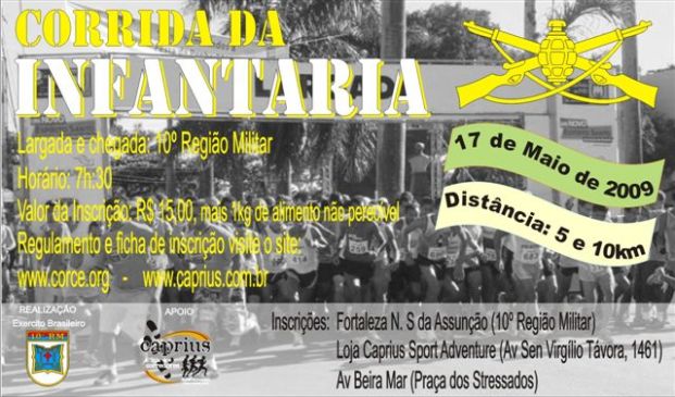 COMEMORAÇÃO NACIONAL DA ARMA DE INFANTARIA - 2009 A CORRIDA DA INFANTARIA - 2009, fez parte da programação da Comemoração Nacional da Arma de Infantaria em Fortaleza, que teve por objetivo comemorar os 199 Anos do Brigadeiro ANTONIO DE SAMPAIO, Patrono da Arma de Infantaria, por intermédio de um evento esportivo, no qual todos os participantes evidenciaram vigor físico e resistência à fadiga, atributos essenciais dos integrantes da "Rainha das Armas". |