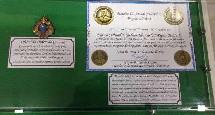 Reverso: No centro, em destaque, o brasão de Viçosa do Ceará - sua terra natal, encimado pelas iniciais de Vila Viçosa Real da América, emoldurado por ramos de louros. No contorno da orla as legendas: MEDALHA 180 ANOS DE NASCIMENTO BRIGADEIRO TIBÚRCIO, acima e 11 DE AGOSTO DE 1837, abaixo, sua data de nascimento.