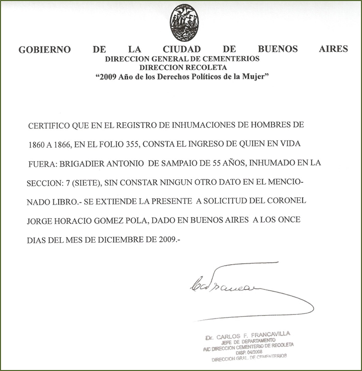 Certidão expedida pela Direção do Cemitério da Recoleta (Buenos Aires - ARG)